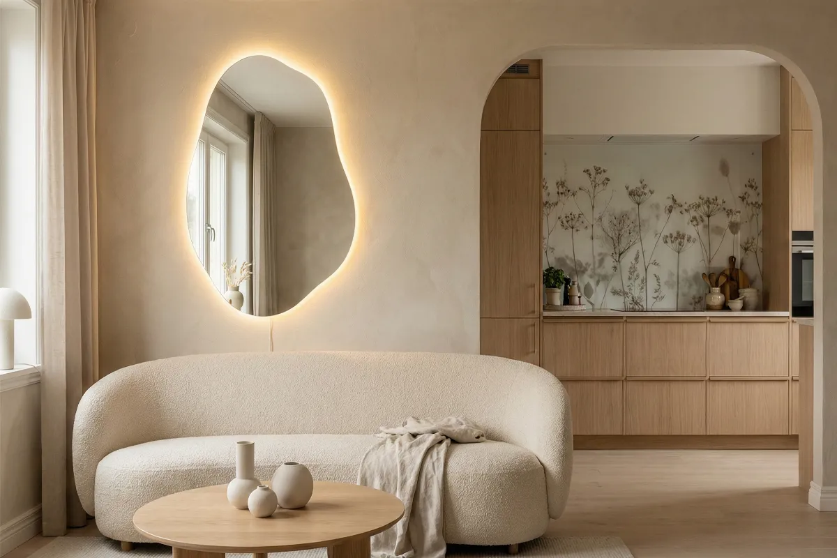 Comment un miroir asymétrique peut-il agrandir une petite pièce ? Grâce à l’absence de lignes droites et prévisibles, le miroir asymétrique trompe le cerveau en effaçant les limites physiques du mur. Il crée une sensation d’ouverture organique, idéale pour les petits appartements urbains.